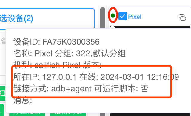 • 链接成功后,设备的左上角小绿点会有详细的信息,直接点击左侧工具栏-开始投屏按钮,或者鼠标放投屏界面右键菜单-开始投屏即可看到投屏页面