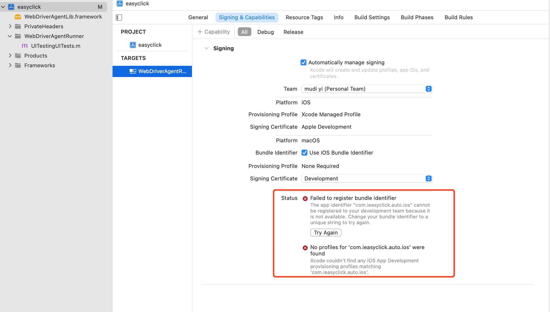Xcode couldn't find any iOS App Development provisioning profiles matching 'com.ieasyclick.auto.ios'.