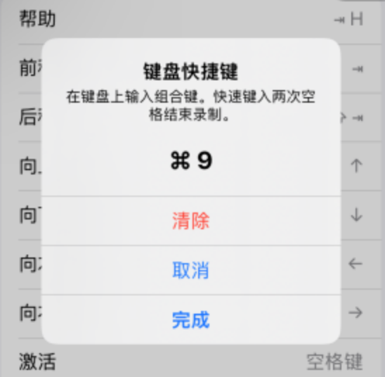 - 先打开手机设置-辅助功能-键盘-全键盘控制-命令选项,点击某个命令,会出现弹窗,要求输入键盘快捷键