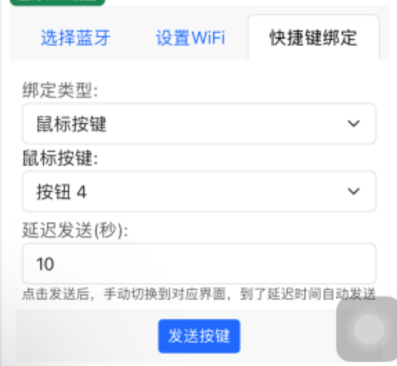 - 双击HOME(没有HOME从底部往上滑切换任务),切换到app设置-蓝牙BLE设置-快捷键绑定界面 ,选择绑定类型为鼠标按键,再选择鼠标按键值,一般建议从按钮4开始,防止冲突