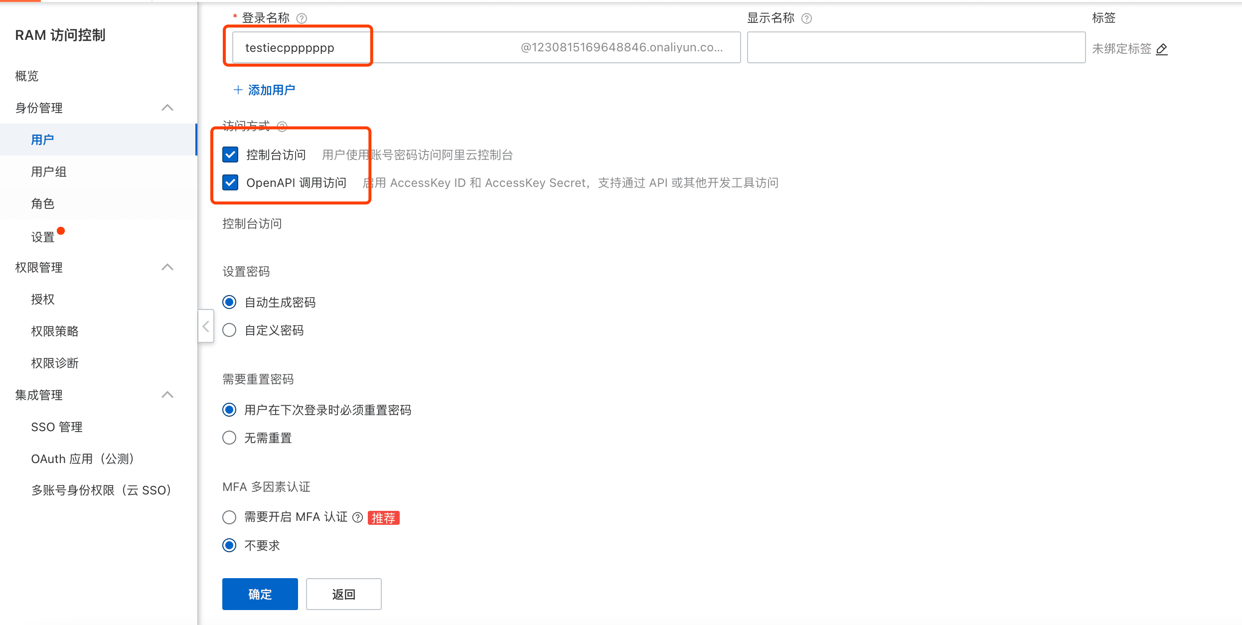 用户名随便写,勾选控制台访问和openapi调用访问,点击确定