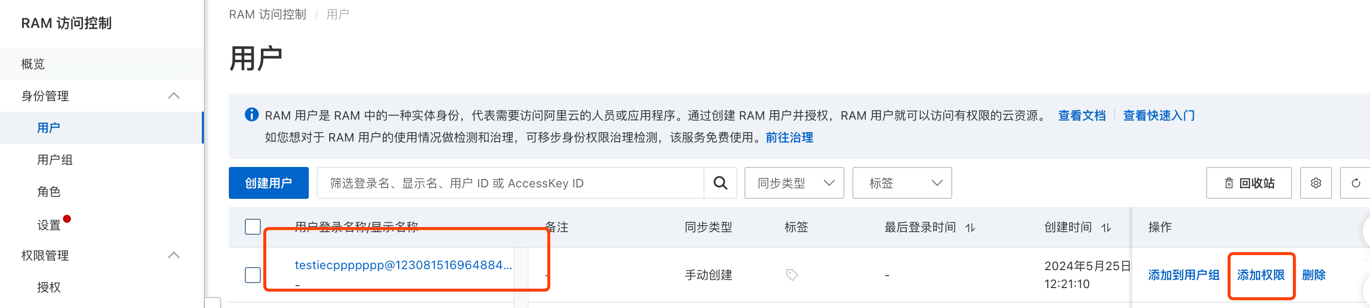 - 选择用户,点击添加权限按钮,勾选 AliyunOSSFullAccess ,点击确认新增授权即可